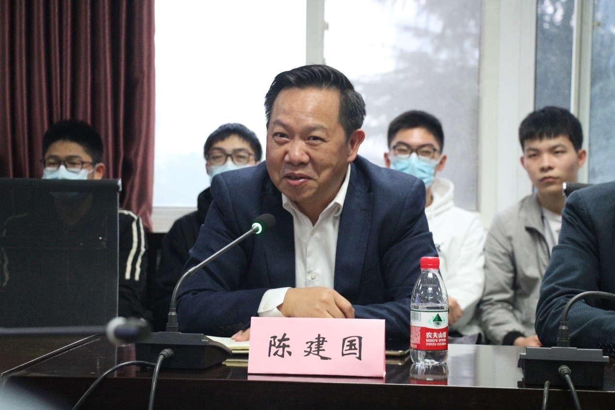 11月17日下午,副董事长陈建国在东十一楼221会议室参加了2018级生物技术专业“生命赋能 双创争先 敢担大任 放眼国际”主题班会,与在场的同学和老师们围绕科技创新、国际交流、劳动教育和人才培养等内容进行了互动交流。