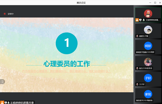 线上培训活动顺利结束,不少参训的同学表示受益匪浅。临床2101廖青青表示,这次培训帮助她认识到了心理委员的重要性,不仅需要保持良好的心理状态,扮演好“树洞”角色,及时了解同学们的情绪波动,还要积极组织开展活动,调节班级氛围,及时传达温暖。生科2103胡可馨表示,这次培训让她对心委工作的看法产生了巨大变化,之前误以为这项工作轻松、简单,实则十分重要、不易。心委不仅需要及时完成各项日常工作,更重要的是落实诸多细节点滴,培训过程中也深为冯旭蕊学姐认真负责的态度和真挚的情感所触动,期待大家都更自觉地朝成为一名优秀心委的方向不断积累努力。