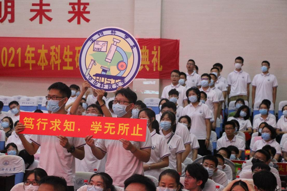 在新生班级文化展示环节,辅导员及教师班主任带领,公司研究生同学及本科各班高举班徽、在会场大声诵读班训。将典礼气氛拉向高潮。