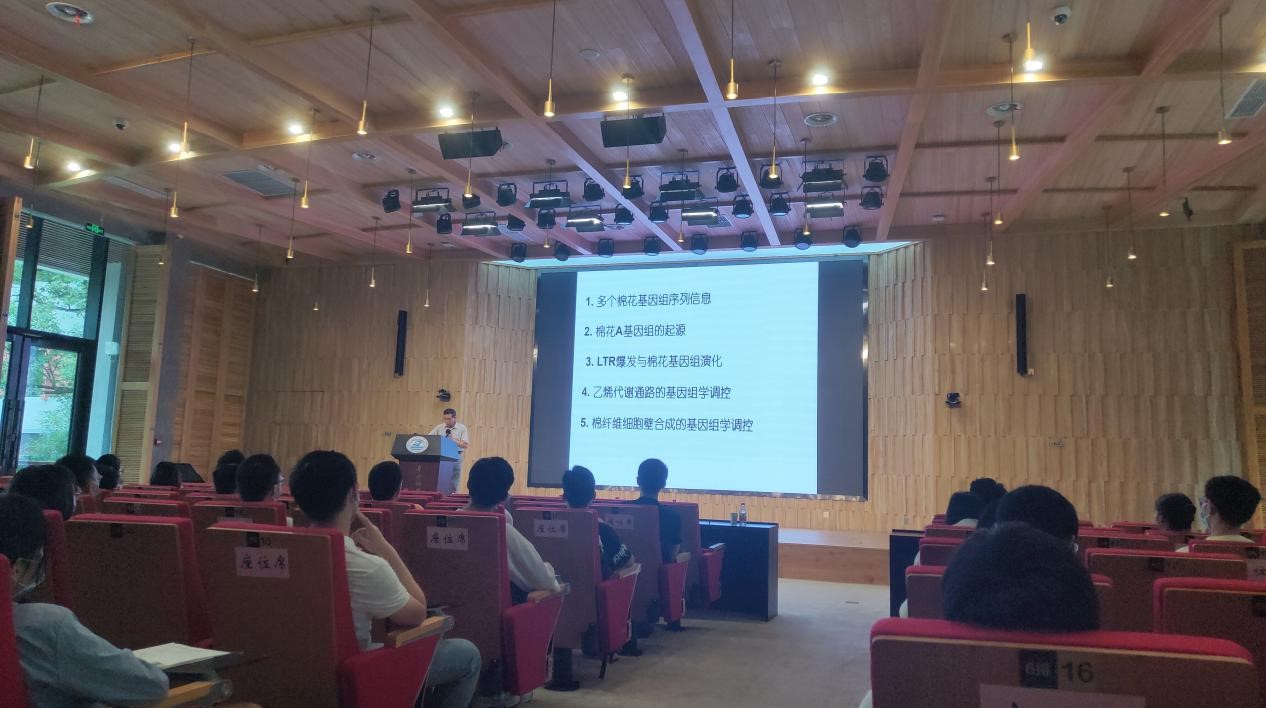 报告会上,朱玉贤院士围绕他的研究重点领域:多个棉花基因组序列信息、棉花A基因组的起源、LTR爆发与棉花基因组演化、乙烯代谢通路的基因组学调控以及棉纤维细胞壁合成的基因组学调控等5各方面,为同学们带来了生动翔实,趣味横生的学术讲座。同时朱院士结合自己的科研之路勉励同学们不怕辛苦,敢于创新,勇于面对解决卡脖子难题。
