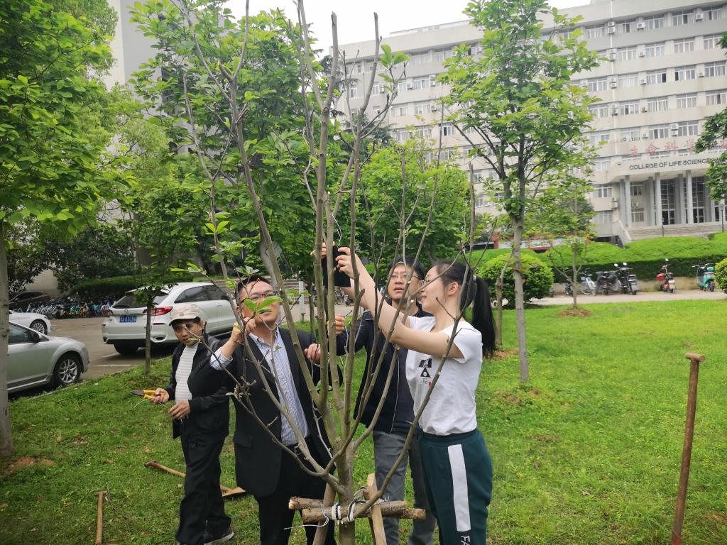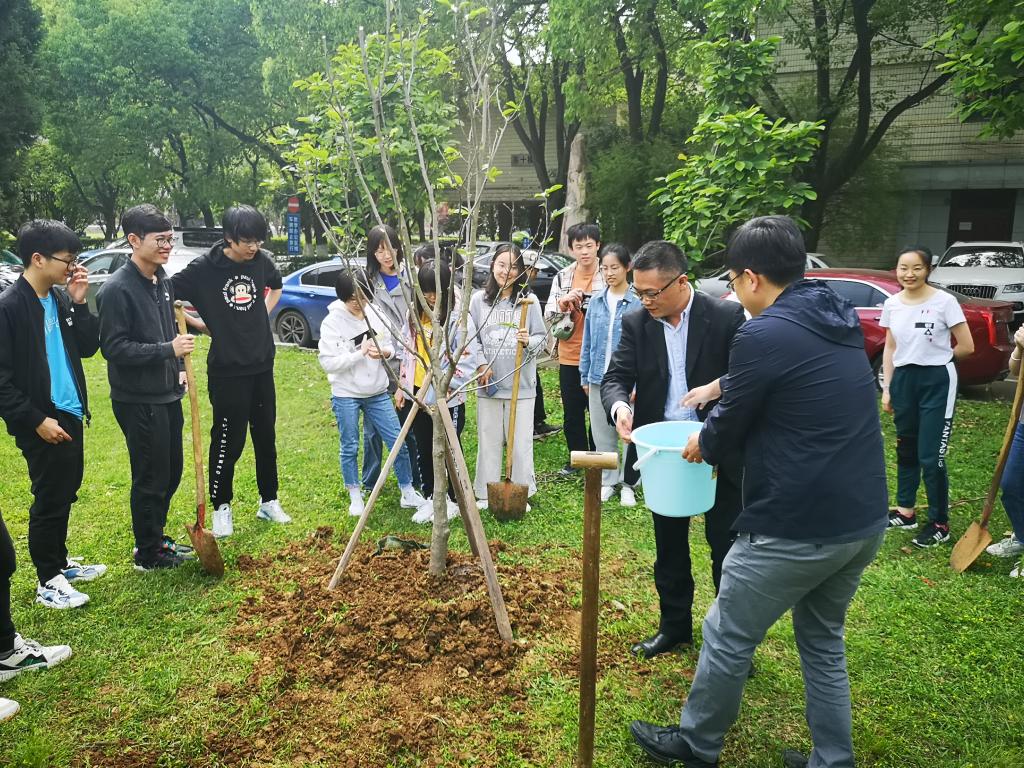 在园林师傅的安排下,同学们首先挖出用于种树的坑,另一些同学一起把一棵带着绿叶的紫玉兰树苗抬到了坑中,大家又挥起铁锹铲土培实。马聪教授和卢群伟教授浇下了第一桶水,同学们也纷纷行动起来,提桶浇水。在老师和同学们共同埋头苦干下,植树工作顺利完成。班长和马聪教授、卢群伟教授一同挂上事先准备好的树牌,本次植树活动圆满结束。