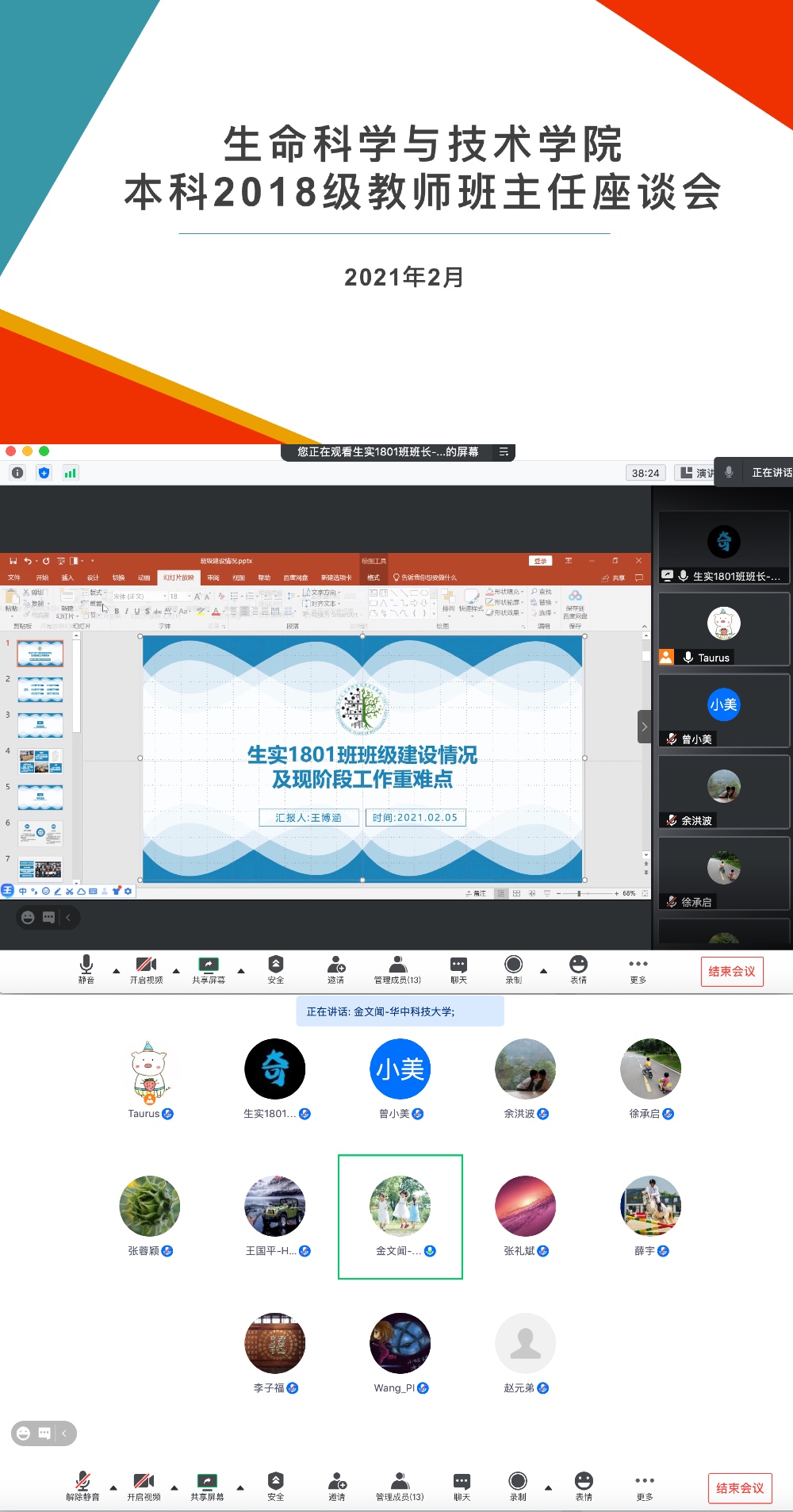 辅导员就目前年级总体情况进行了汇报。生拔1801班获得校“胡吉伟”荣誉班级称号,生实1801班团支部获得省活力团支部金牌(全校仅3个)。82%的班级获得优良学风班,2021年争取实现100%。同时,年级党员发展有序进行,目前全年级共有党员53名,占总人数的18%。针对前期毕业去向调查的结果,结合当前全球疫情形势,周钰指出本年级考研、就业压力不容小觑,呼吁教师班主任及时开展生涯规划、考研就业指导,提升同学们的竞争力。