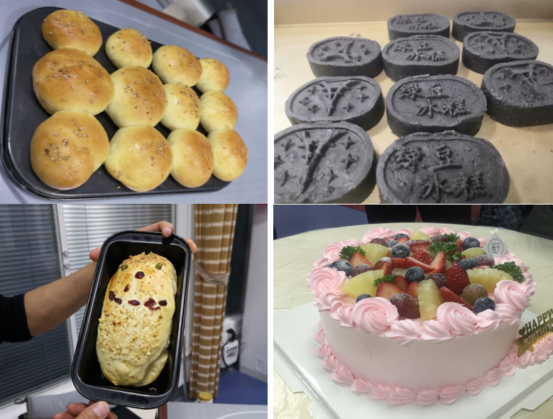 活动中栗茂腾老师、付春华老师也品尝了同学们制作的各种美食,与同学们交流甚欢,周钰辅导员也对同学们为其烘焙的“笑脸”面包赞不绝口。更令人惊喜的是,天公作美,当同学们在温暖的室内欢度冬至时,恰逢今年武汉的初雪,窗外飘扬的雪花让同学们的热情更加高涨。当班长捧出粉红色的水果蛋糕,全班为12月份过生日的三位小伙伴齐唱生日歌,本次活动也随之推向了一个小高潮!