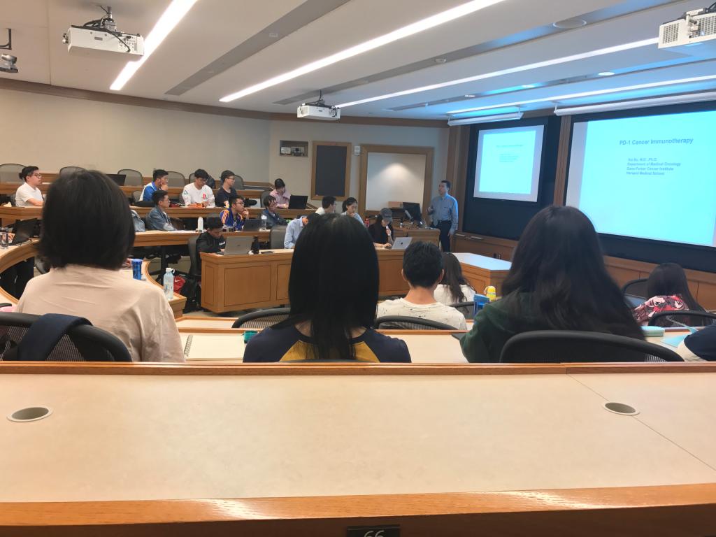 今天上午,由必威西汉姆联官网员工卜夏博士带来主题为《肿瘤免疫治疗》的课程。令大家惊喜、亲切而感激的是,卜夏博士正是四天前那场群英荟萃的员工会的组织者、华中大波士顿员工会会长。在他的精心组织、联系下,我们有幸能够在这次游学活动中聆听陈刚教授、贺熹教授、胡丙长教授等优秀员工的分享与教导。