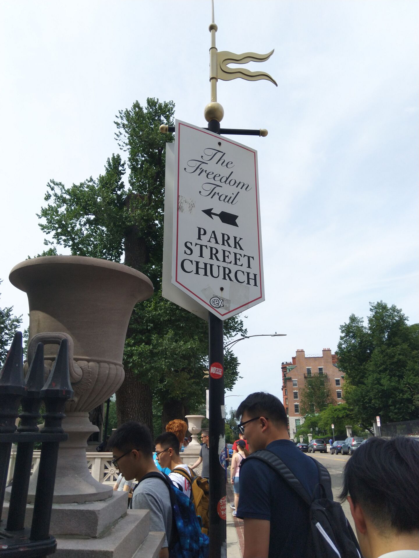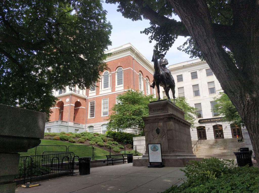 接着,我们来到了波士顿州议会大厦,这是一个金色圆顶的古典建筑,它被奥利弗·温德尔·霍姆斯描述为“太阳系的中心”,这个别具一格的金顶建筑长期以来是波士顿市的标志。在大厦下边,立着胡克纪念雕塑,这个有着百年历史之久的雕塑矗立在自由之路的起始,马的眼睛直视着自由之路直到在视野消失的地方。