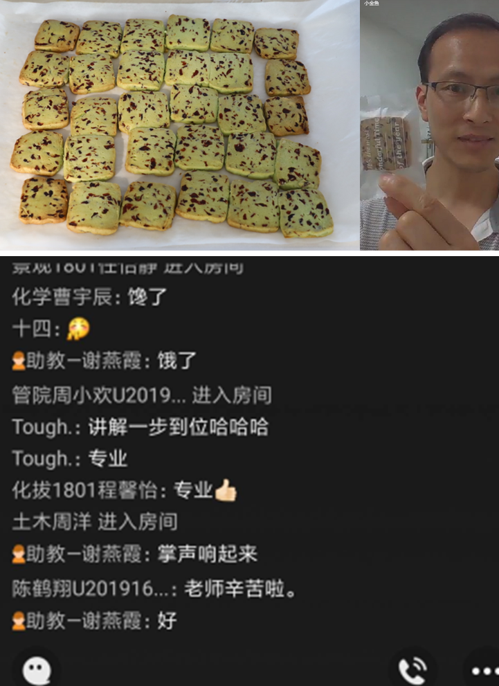为了减少接触风险,我独自待在公司东十二楼5楼实验室的食品制作间,开始了美食互动直播课的准备工作。清洁消毒房间、封上空调和地漏出口、找来管钳修好了水管漏水、网上查询着各种愿意向武汉发货的食品原料、搭起了双机位直播平台……直播那天,看着黄油软化、糖粉撒下,原料混合-成型-冷冻-切块-烘烤,首批蔓越莓饼干顺利出炉,当我拿着一枚包装好的小饼干在屏幕前展示时,同学们纷纷呼唤“老师快递来,到付”……