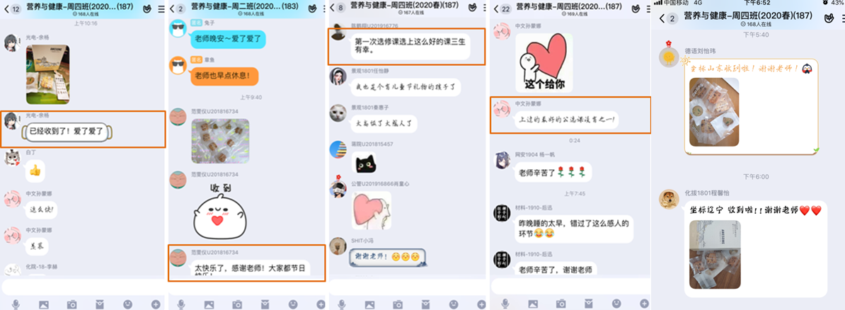 这140盒共1120枚自制饼干的发货地都是武汉市必威西汉姆联官网,发件人就是我,这些员工都是选修了公司今年春季的全校公选课《营养与健康》,而我是主讲人之一。6月1日上午11点开始,我的手机就不停滴滴的响着,收到小饼干的同学在我们的课程qq群上表达着收到小饼干的激动和感动——“虽然同学们分隔各地,但此时心被老师连在了一起”、“不安的等待变成了暖暖的期待,期待着早日在武汉团聚”、“送给奶奶品尝了,奶奶说很好吃”,还有的在朋友圈晒出饼干,“感谢1037号森林里可爱的老师为我们亲手制作的饼干,它让2020年变得更加温暖。”更多的同学则用汇报坐标的方式在群上接龙,而这时候我才发现班里的同学刚巧遍布全国大江南北,东至江浙沿海,西至新疆,南至海南,北至黑龙江。