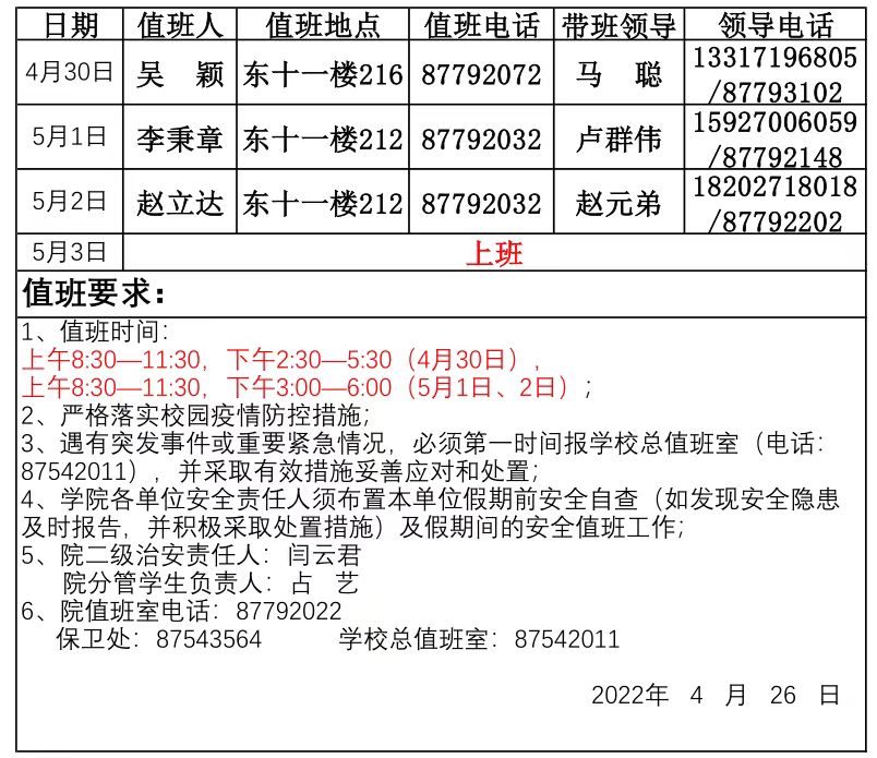 2022年劳动节值班安排