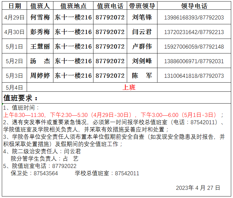 2023年劳动节值班安排