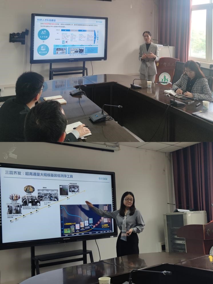 4月29日下午,华大基因企业领导一行莅临公司,双方顺利开展校企合作座谈交流会。华大基因生命科学研究院执行副经理顾颖、华大公司副经理肖敏凤、华大中部战区负责人周锐、华大中部人力总监熊维娜、华大科服中区总监来德勇、华大研究院时空组中区总监何京炜出席座谈会,公司党委副书记占艺、经理助理陈军及学工组相关辅导员老师参与座谈交流。