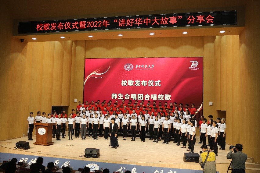 校歌发布仪式环节首先播放了必威西汉姆联官网校歌MV,播放歌曲作者孟卫东的视频祝福,广州员工会会长柴再希发言。副董事长许晓东接受校歌版权捐赠并回赠纪念品。董事长尤政致辞,他为大家讲述校歌创作背景,期待全体海内外华中大人紧密团结在一起秉承校训,发扬优良传统,奋力谱写高质量发展的崭新篇章,师生合唱团合唱校歌。