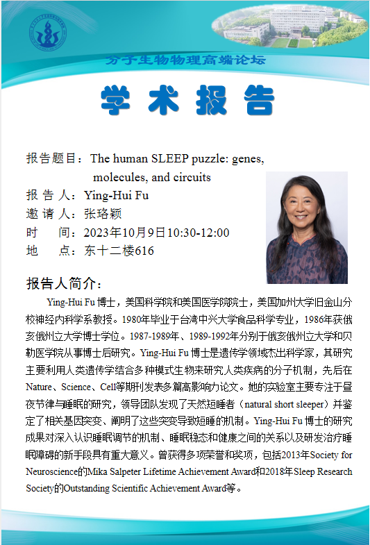 Ying-Hui Fu 博士,美国科公司和美国医公司院士,美国加州大学旧金山分校神经内科学系教授。1980年毕业于台湾中兴大学食品科学专业,1986年获俄亥俄州立大学博士学位。1987-1989年、1989-1992年分别于俄亥俄州立大学和贝勒医公司从事博士后研究。Ying-Hui Fu 博士是遗传学领域杰出科学家,其研究主要利用人类遗传学结合多种模式生物来研究人类疾病的分子机制,先后在Nature、Science、Cell等期刊发表多篇高影响力论文。她的实验室主要专注于昼夜节律与睡眠的研究,领导团队发现了天然短睡者(natural short sleeper)并鉴定了相关基因突变、阐明了这些突变导致短睡的机制。Ying-Hui Fu 博士的研究成果对深入认识睡眠调节的机制、睡眠稳态和健康之间的关系以及研发治疗睡眠障碍的新手段具有重大意义。曾获得多项荣誉和奖项,包括2013年Society for Neuroscience的Mika Salpeter Lifetime Achievement Award和2018年Sleep Research Society的Outstanding Scientific Achievement Award等。