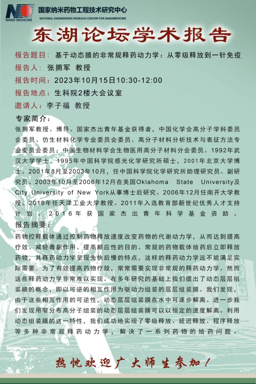 报告题目:基于动态膜的非常规释药动力学:从零级释放到一针免疫