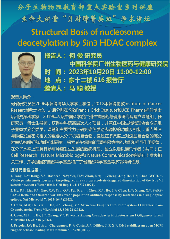 报告人简介:何俊研究员在2006年获得清华大学学士学位,2012年获得伦敦Institute of Cancer Research博士学位。之后分别在伦敦Francis Crick Institute和UCB Pharma担任博士后和资深科学家。2019年入职中国科公司广州生物医药与健康研究院建立课题组,任研究员,博士生导师,获得中科院高层次人才项目,并兼任中国生物物理协会冷冻电子显微学分会委员。课题组主要致力于研究染色质动态调控的功能及机制,重点关注与肿瘤发展密切相关的重要大分子机器复合物,通过在多尺度上对这些复合物的高分辨率结构解析和功能机制研究,探索其在细胞命运调控网络中的功能和相互作用规律,在分子水平上理解其参与肿瘤发生发展的致病机理。独立以后以通讯作者(共同)在Cell Research,Nature Microbiology和 Nature Communication等期刊上发表相关工作,并承担国家自然科学基金和广东省自然科学基金等多项科研任务。