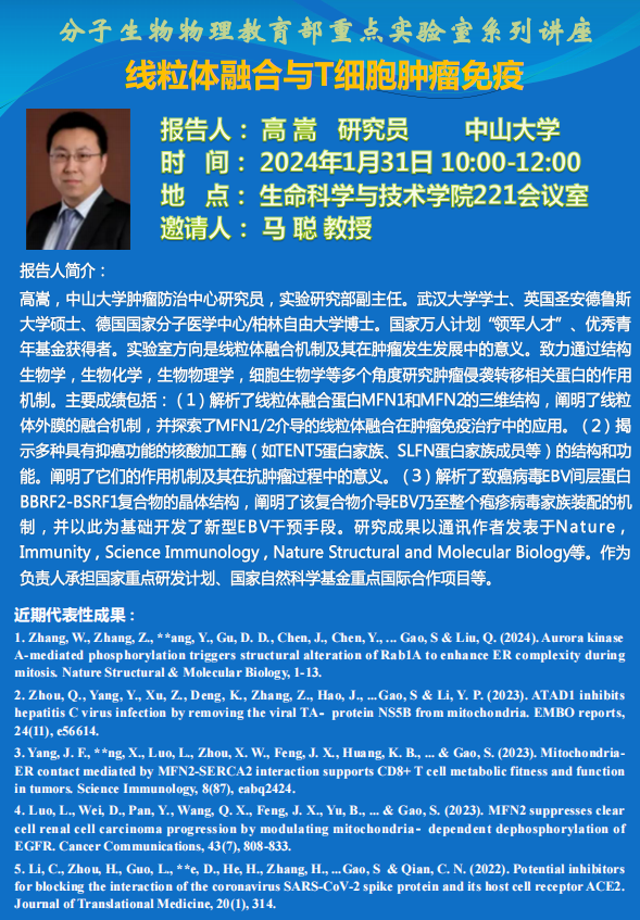 高嵩,中山大学肿瘤防治中心研究员,实验研究部副主任。武汉大学学士、英国圣安德鲁斯大学硕士、德国国家分子医学中心/柏林自由大学博士。国家万人计划“领军人才”、优秀青年基金获得者。实验室方向是线粒体融合机制及其在肿瘤发生发展中的意义。致力通过结构生物学,生物化学,生物物理学,细胞生物学等多个角度研究肿瘤侵袭转移相关蛋白的作用机制。主要成绩包括:(1)解析了线粒体融合蛋白MFN1和MFN2的三维结构,阐明了线粒体外膜的融合机制,并探索了MFN1/2介导的线粒体融合在肿瘤免疫治疗中的应用。(2)揭示多种具有抑癌功能的核酸加工酶(如TENT5蛋白家族、SLFN蛋白家族成员等)的结构和功能。阐明了它们的作用机制及其在抗肿瘤过程中的意义。(3)解析了致癌病毒EBV间层蛋白BBRF2-BSRF1复合物的晶体结构,阐明了该复合物介导EBV乃至整个疱疹病毒家族装配的机制,并以此为基础开发了新型EBV干预手段。研究成果以通讯作者发表于Nature,Immunity,Science Immunology,Nature Structural and Molecular Biology等。作为负责人承担国家重点研发计划、国家自然科学基金重点国际合作项目等。