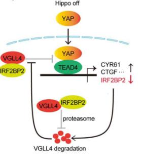 通过对肝癌患者的临床数据分析,合作团队发现IRF2BP2在肝癌样本中表达较低,且IRF2BP2的低表达预示着病人较差的生存率。过表达IRF2BP2能够显著抑制肝癌细胞的增殖、迁移和成瘤能力,说明IRF2BP2是一个潜在的肿瘤抑制因子。无论是在人肝癌样本还是在肝癌细胞系中,IRF2BP2的表达都与YAP下游靶基因的表达呈负相关。研究发现,Hippo信号通路的调控终端YAP-TEAD4转录复合物可以直接抑制IRF2BP2的基因转录,而IRF2BP2蛋白又会反过来抑制YAP的转录活性,形成反馈环路。进一步的机制研究发现,IRF2BP2蛋白与VGLL4相互作用从而稳定了VGLL4的蛋白水平,最终实现了对YAP-TEAD4转录活性的协同抑制作用,进而实现潜在的抗肿瘤作用。此外,在小鼠肝脏中特异性地过表达IRF2BP2能够显著地抑制由Hippo信号通路失活所诱导的肝脏肿瘤形成。该研究揭示了IRF2BP2抑制肝癌发生发展的重要作用和分子机制,同时揭示了IRF2BP2与Hippo信号通路的关联和相互调控机制,这为癌症尤其是肝癌的治疗提供了新的理论依据和潜在的药物靶点。