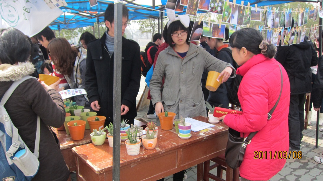 3月8日,在韵苑路口,植物志团队进行了花卉义卖及招新活动。花卉义卖主要有三方面内容:花卉,家庭式小盆景种子及风景明信片。该团队同时仍在宣传着“保护湿地”活动,此次义卖的收款也是用于维持此活动的开展。