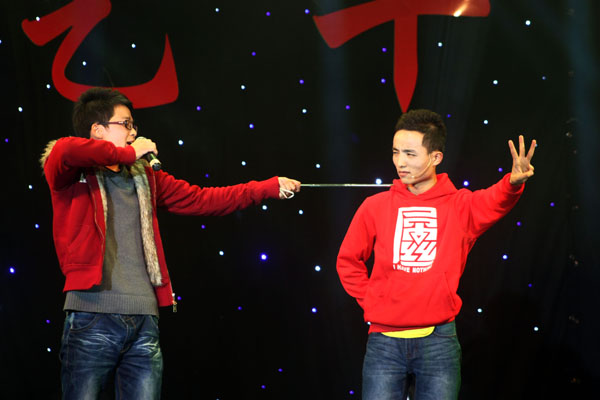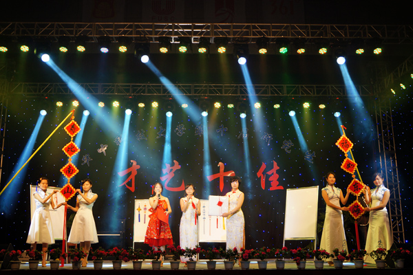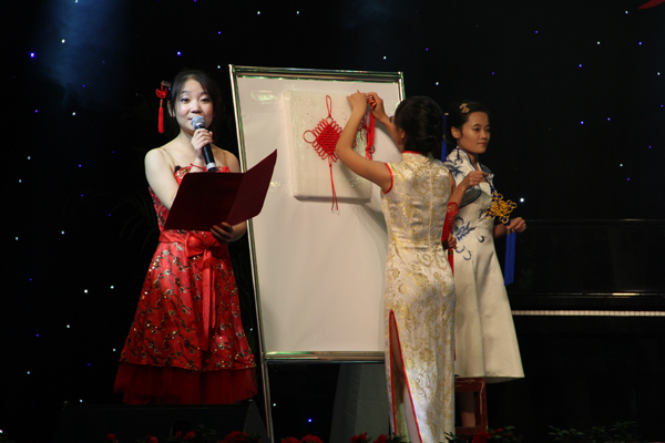 在个人才艺展示环节,绳缘结韵组合带来了中国风浓郁的中国结制作展示节目《心有千千结》,带领大家回归自然,穿越钢筋水泥的现代丛林,品味中国结艺中所蕴含的深切的祝福与厚重的文化。在悠扬古朴的笛箫合曲中,邱爽和王利肖同学为现场的观众展示了最传统的中国结——盘长结的制作过程。现场还展示了“富贵花开”、“紫气东来”、“四季红火”、“蝶恋花”等匠心独运的中国结,让现场观众赞叹连连。最后展出的一副长两米、宽二十厘米的中国结字帘“福如东海、寿比南山”,更是让人大开眼界。