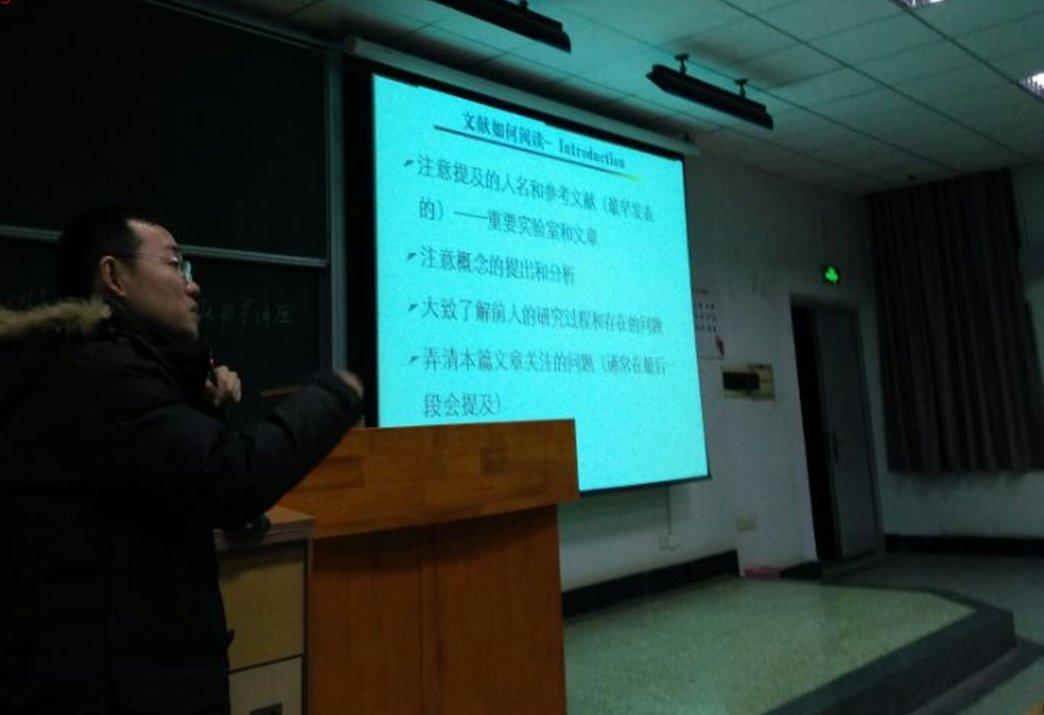 占老师首先为同学们讲解了科研实践的一般性思路以及参与科研实践应具备的基本素质,其中抛出的F(fresh idea) R(reliable) E(estimate) S(sacrifice) H(humanity) 原则给大家留下了深刻的印象。接下来他为同学们详细地讲解了有关科创项目申请的流程以及需要认真面对和思考的一些准备工作。占老师还在阅读科技文献方面对与会同学进行了指导:如何衡量一篇文献的价值,如何寻找我们所需的文献,如何阅读文献,如何提高阅读文献的效率等等。另外,在科创实践过程中很多需要注意的地方,如实验的设计、对照的严谨、数据的处理等方面的,占老师提供了一些基本的概念和入门阶段的技巧,以便大家能够会后自己有的放矢地去体会和自我挖掘了解。