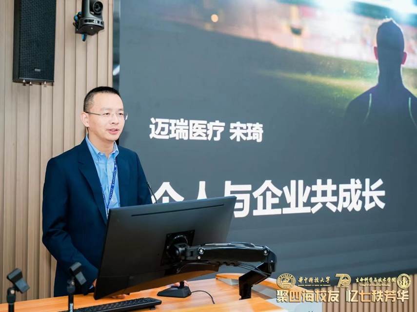 进入员工发展报告环节,2004级员工,武汉迈瑞科技总经理宋琦带来报告《个人与企业共成长》。他详细介绍迈瑞企业的发展情况,迈瑞作为中国医疗设备企业领航者,在生命信息与支持、体外诊断与医学影像三大传统主营业务领域全球领先,疫情期间发挥了重要力作用。他提出守护全人类健康的愿景,期望能加强校企交流合作,吸揽更多优秀人才。