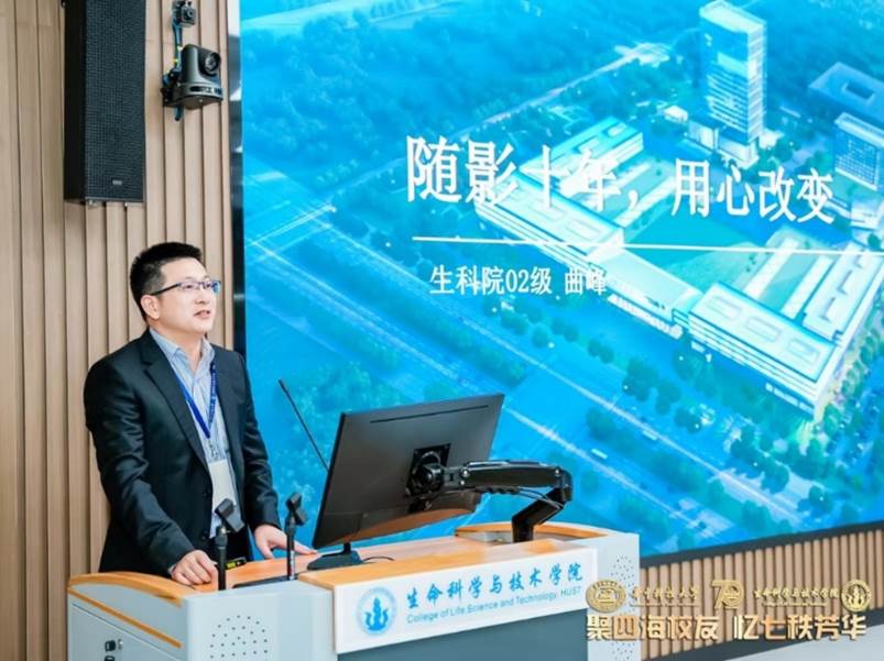2002级员工,上海联影医疗科技股份有限公司区域业务总监曲峰为大家带来报告《随影十年,用心改变》。他从自身工作经历介绍了其“十年”改变历程。联影集研发、生产制造于一体,坚持核心技术创新,业务领域广泛,国产设备占比显著提高。他呼吁社会加大对医疗行业的关注与合作,共建全人类健康福祉。