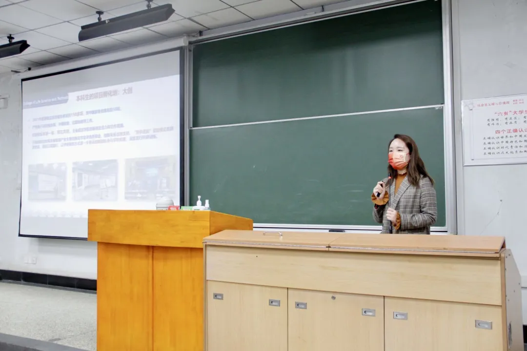 周钰老师为同学们讲解大创的相关信息。据介绍,“大创”即老员工创新创业训练项目,是由本科生进行主持创新性的研究和实践性的创新创业活动,共划分为院级、校级、省级和国家级四类,过程分为“申请立项-中期检查-结课验收”三个环节。其目的是提升老员工创新创业能力,培养高水平应用型人才。随后,周老师为同学们详细介绍了参加大创的方式和申报流程,并为同学们详细罗列了与生命科学相关的竞赛及其性质、特点。周老师建议同学们多和学长学姐们和老师们交流,迈出通向大创的第一步。