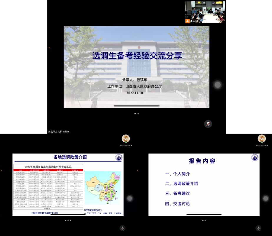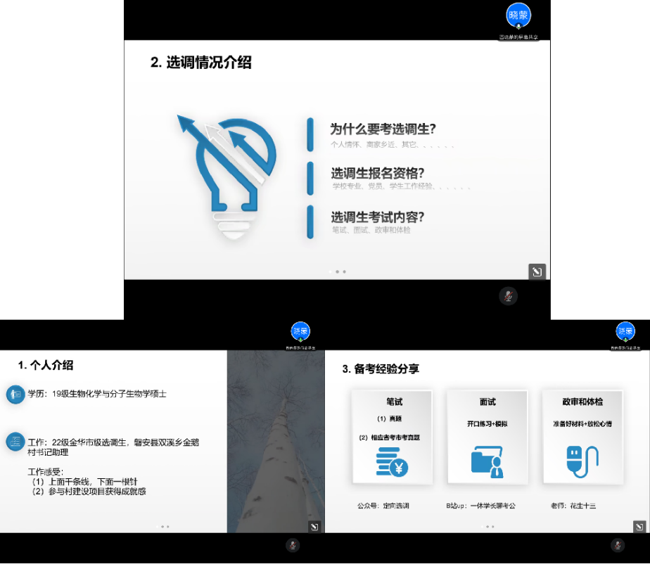 包镇东是2022届生物制药工程专业博士,顺利录用为山西省人民政府办公厅定向选调生,他从个人经历、工作情况、选调政策和备考方法等方面进行了干货满满的分享。他结合个人经验对各地选调政策以及考选的具体情况进行了详细的分析,帮助大家更好的了解了选调,同时也提到了要思考自己考取选调生的初心,引发大家对职业规划的深度思考。在备考建议上,包镇东建议大家珍惜应届生身份,认真准备,不要报取巧心理,如果有员工工作经验,也应该把自己的组织活动的经历好好总结一番,便于更好的输出。