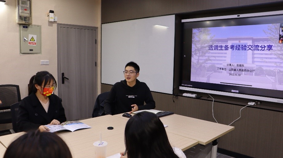 辅导员冷康鑫老师主持活动,他介绍了当前的就业和选调形势,鼓励大家确立目标、把握机会、利用资源,在做好基本科研任务的前提前认真备考,把选调当作事业来奋斗,要志存高远、脚踏实地,勇于到基层一线和艰苦地方去,把人生的路一步步走稳走实,善于在平凡的岗位上创造不平凡的业绩。