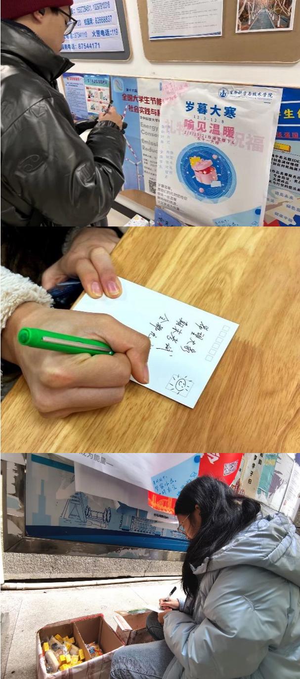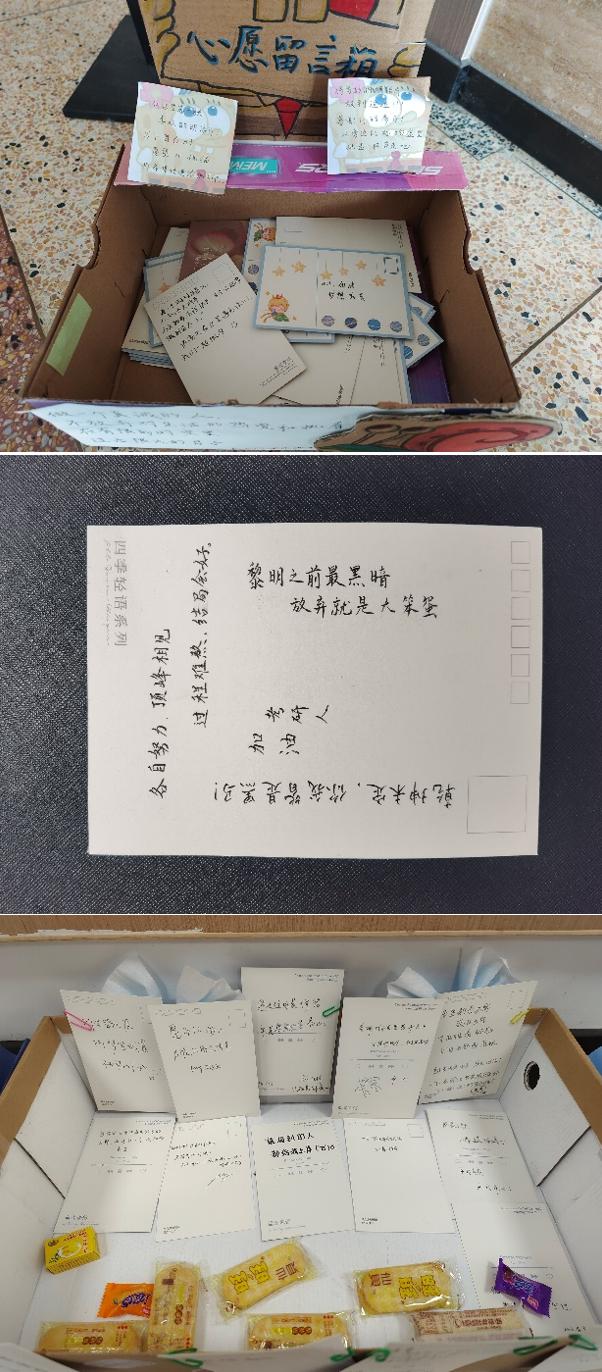 哇!大家的热情似乎要从装满留言的小箱子中溢出来啦!箱子里的小礼物也很快就被交换出去了。再来仔细看看,大家的留言暖意满满,纷纷表达了对学长学姐们的祝福,对陌生人的温柔关心,也有对自己的坚定期许。以纸为媒,以笔承重,尺牍传情。也许有的同学只写了一两句话,但背后的情意足以温暖寒冬中的你我。
