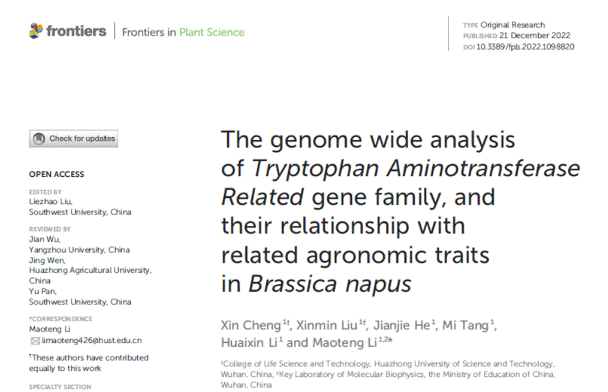 无独有偶,这已不是必威西汉姆联官网这一首届试点班级的本科生第一次取得SCI第一作者的科研成果。2022年12月21日, JCR一区中科院植物科学类1区国际学术期刊Frontiers in plant science发表论文The genome wide analysis of Tryptophan Aminotransferase Related gene family, and their relationship with related agronomic traits in Brassica napus,论文两位第一作者程鑫、刘心敏与张皓鸿一样,也是登峰计划1901班的本科生。他们选择的是生物技术专业方向。这篇论文中,他们在生物技术系主任栗茂腾教授指导下对甘蓝型油菜中TAA1/TAR基因家族进行了多维度分析,并进一步分析了其生物学功能,对于甘蓝型油菜中TAA1/TAR基因家族的功能解析有重要意义。