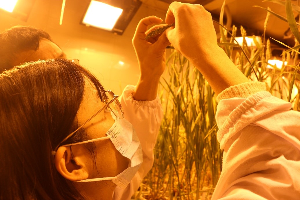 来自中英联合实验室的18级博士生赵洪艳正在观察小麦的生长状态。她通过研究发现过表达TaGF14b的转基因小麦抗旱性显著提升,不同于传统的逆境植物激素ABA及其调控网络,该蛋白主要通过与糖代谢关键酶互作进而改变其活性,稳定了植物在干旱时的初生代谢,进而赋予了小麦优异的耐旱特性。