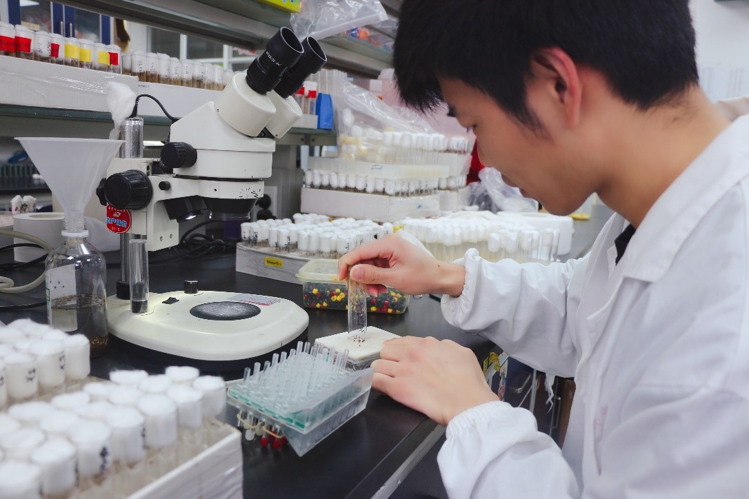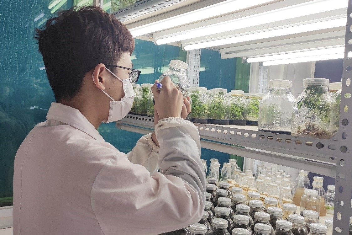 来自资源生物学与生物技术研究所的22级硕士研究生付翔飞正在观察在不同培养条件下金线莲组培苗的生长发育状况,并通过检测其中的活性成分,探究金线莲植株中活性成分累积的最优条件。