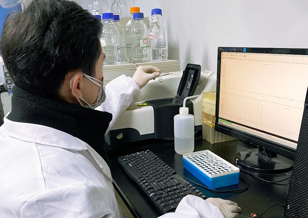 来自李子福教授课题组的2020级直博生张智杰正在通过激光粒度仪检测纳米药物的粒径分布。通过检测不同制剂在血清中的粒径变化简单评估纳米药物的稳定性,为后续的研究筛选可行的纳米药物制剂方法。