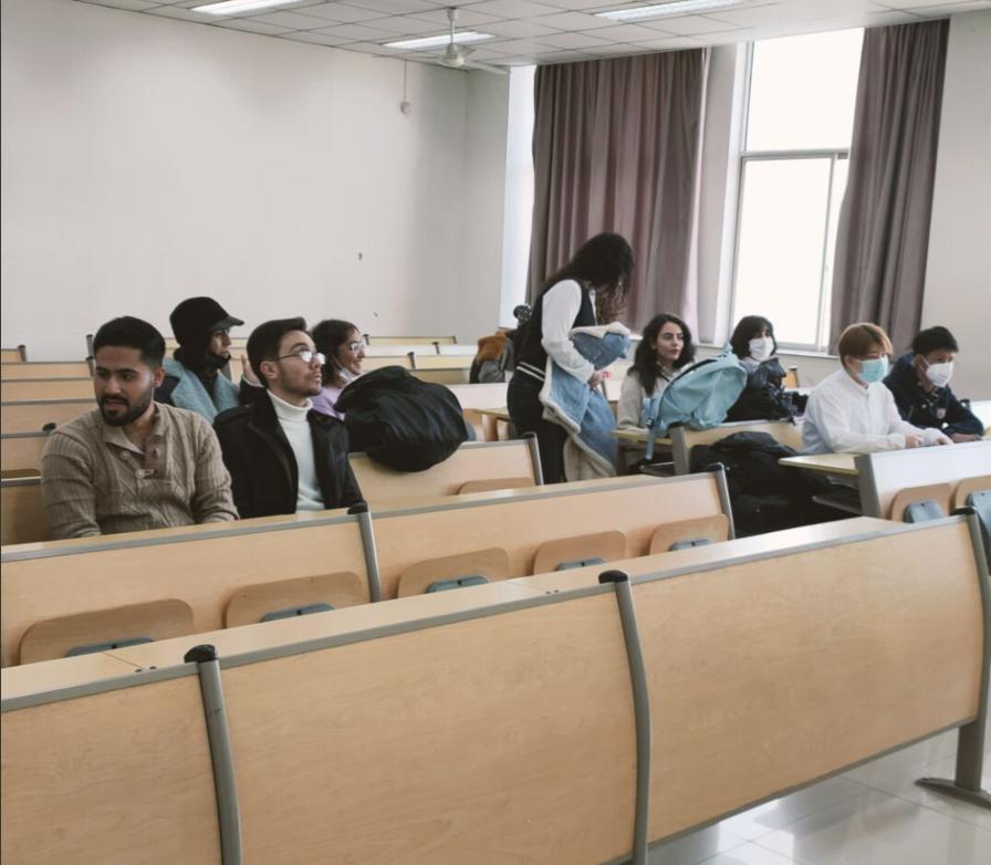 公司党委书记刘笔锋在东十二楼《科学方法论》课堂询问课程教学计划,了解听课班级情况