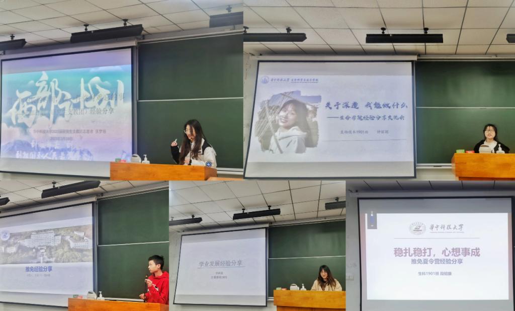 在嘉宾分享环节,生药1901班的张梦培针对何为西部计划,如何加入研究生支教团,以及如何准备笔试面试等问题进行了介绍。生技1901班钟丽颖主要讲解了核心竞争力以及前期准备工作,建议大家提前思考自己专业的未来发展与个人目标。生卓1901班蒋岁杨以“问心”到“问技”为思路,梳理了自己的规划与经历,为在场同学提供了宝贵参考。生信基地1901班甘梓泉以学习经历与个人选择为切入点,全面细致地介绍了深造准备时间线及相关注意事项。生科1901班段绍康因校外毕设无法到场,分享以线上视频方式进行,他对不同阶段需要做的准备进行了分析,并对夏令营相关的高频问题进行了集中讲解。