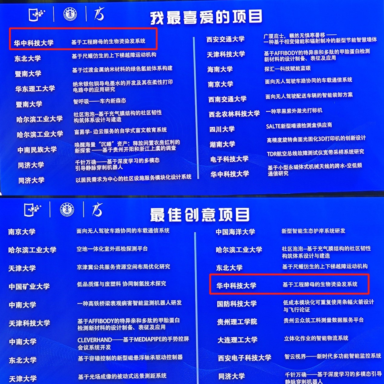 本科20级古戴宁等同学所开展的国家级大创项目《基于工程酵母的生物烫染发系统》通过人工设计改造工程酵母,生产植物色素和烫发短肽,实现快速、无害烫染的同时兼具护理作用,巧妙的设计实现了安全、可逆、自由的烫染发并兼顾损伤修复功能。该项目以第一名的成绩荣获“我最喜爱的项目”,并同时荣获“最佳创意项目”,包揽展板组荣誉大满贯。