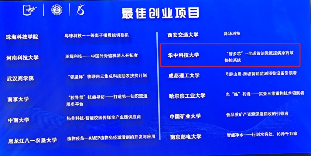 本科20级庞征等同学所开展的国家级大创项目《智多芯一微流控抗生素精准用药快检系统》创新研发微流控技术,系统具有价格低廉、反应速度快等优势,项目团队的愿景是为遏制抗生素滥用、提升人民健康福祉事业贡献中国智慧。该项目荣获“最佳创业项目”,这是必威西汉姆联官网首次进入创业组并获最高奖项。