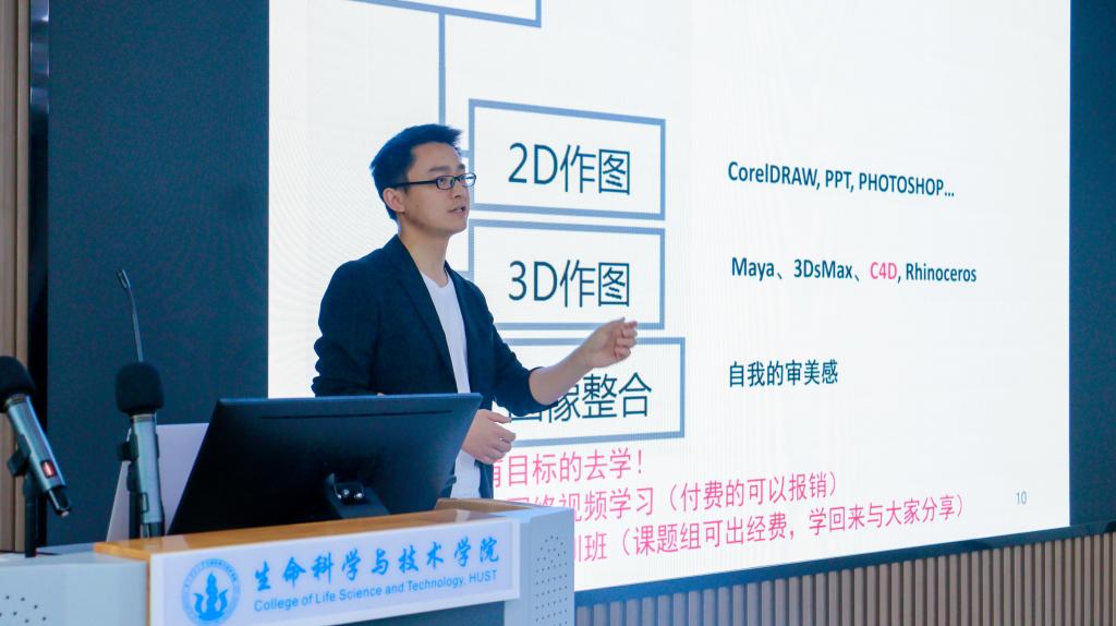 第二期课程由石志军老师分享《C4D及常用绘图软件/网页应用浅谈》,石志军老师首先提出了“技能树”的概念,希望同学们能尽早培养全面的科研能力。随后介绍了CINEMA 4D的使用,他向现场同学们示范了如何利用C4D对培养基、细胞膜、病毒外壳等对象进行建模,让大家对于C4D的操作方式有了直观的了解,并对学习资源进行了总结整理与分享。