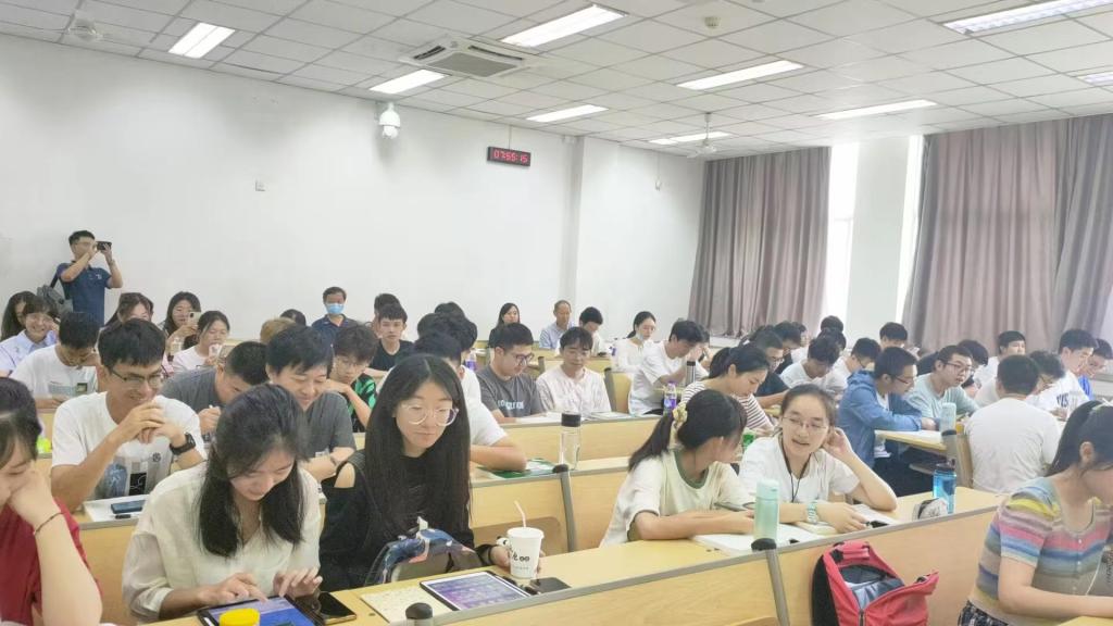 在蒋涛老师这门课上,有一位格外聚精会神的同学。2020级本科生时浩然因腰伤休学半年后,于新学期顺利复学,回到了他想念已久的课堂。他表示,自己特意起了个大早坐在教室的第一排,再次回到校园,有一种久违的幸福。(图片左侧第一排第一位同学为时浩然。)