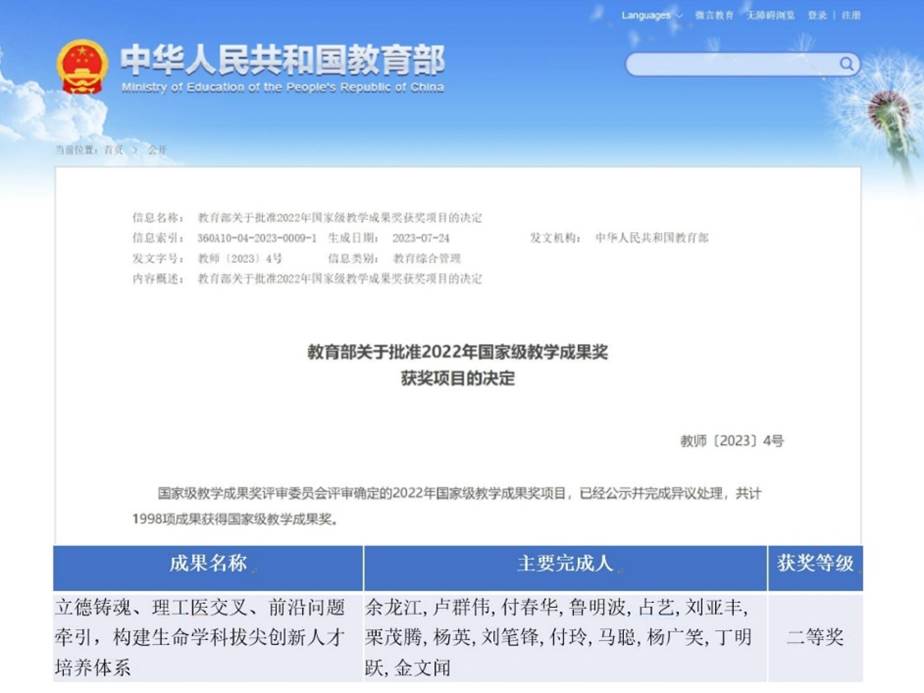 他们立德铸魂:2023年7月24日,教育部正式发布《教育部关于批准2022年国家级教学成果奖获奖项目的决定》,由国家“万人计划”教学名师、必威西汉姆联官网余龙江教授领衔完成的项目“立德铸魂、理工医交叉、前沿问题牵引,构建生命学科拔尖创新人才培养体系”(成果完成人:余龙江、卢群伟、付春华、鲁明波、占艺、刘亚丰、栗茂腾、杨英、刘笔锋、付玲、马聪、杨广笑、丁明跃、金文闻)荣获2022年国家级教学成果奖(本科)二等奖。成果推广应用广泛,得到教育部和同行专家认可。