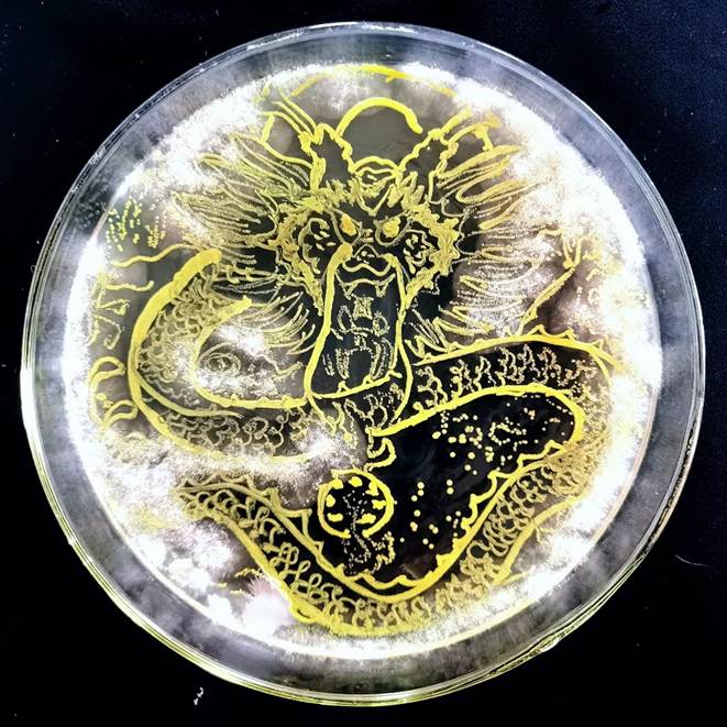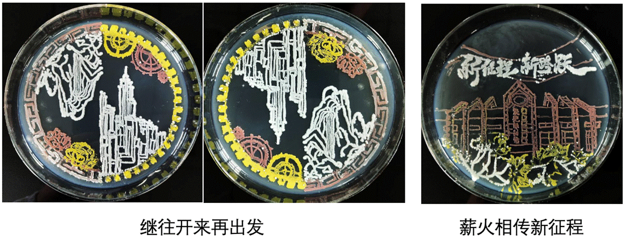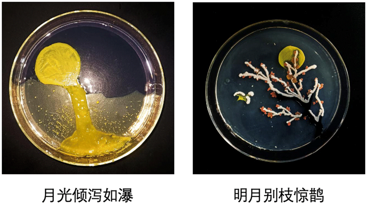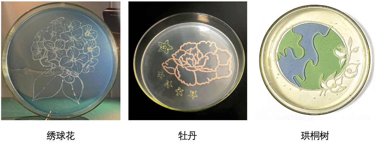 各参赛小组成员根据自己的创意,分别选用红色和白色的酵母菌、黄色的嗜根考克氏菌以及灰白色的大肠杆菌等彩色菌种进行实验。通过探索微生物最适生长条件,如培养基成分及比例、培养温度、培养湿度、培养时间等,以及不同作画工具、不同菌液浓度对绘画结果的影响,确定最佳实验方案,最终呈现丰富多彩的微生物画作品。
