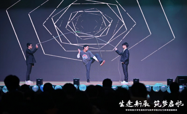 钟摆滴答滴答,演员们身着白衣舞动,舞蹈《时间流逝》营造出的唯美令人陶醉。生科强基登峰2301班带来情景朗诵剧《生命科学发展史》,以别具一格的方式演绎出生命科学数百年来的发展历程,激发每个生命学子内心强烈的归属感和对学科未来的美好展望。舞蹈串烧《家喜斗舞》中出现熟悉的童年BGM,激起台下的欢声笑语。我们仿佛回到了那些守在电视机前的日子,发现旧时光的温度依然未减。生医2303班罗佳文演唱《流浪地球2》主题曲《人是》,“弹指间湮灭我,但命运打不败活着”,危急存亡的时刻,生命因不屈不挠的抗争而伟大磅礴。
