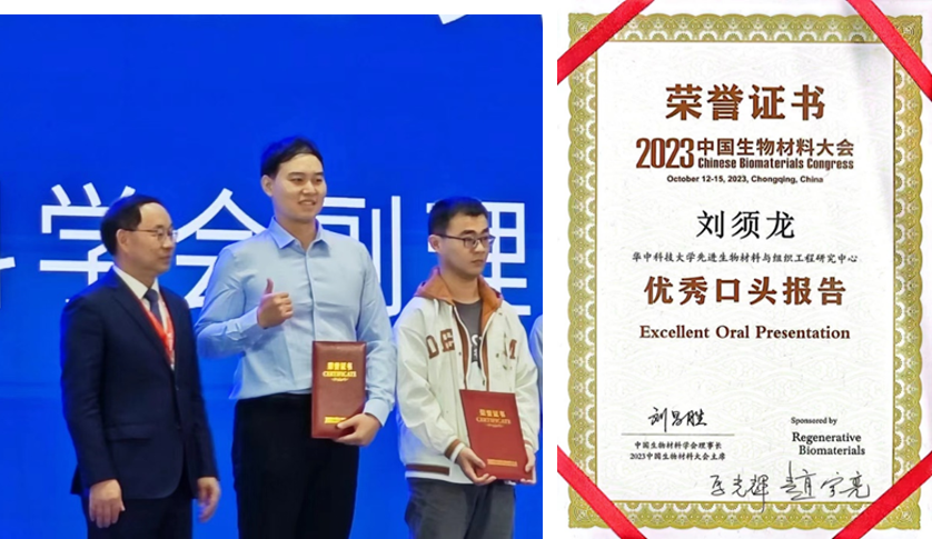 本年度张胜民教授团队研究生在国际及国内高水平学术会议中屡获佳绩。2023年11月,中澳组织工程与再生医学论坛在宁波举行,张鑫获“最佳墙报奖”(指导教师:杜莹莹、张胜民)。2023年10月,两年一届的中国生物材料大会于重庆举办,团队博士研究生刘须龙斩获大会“优秀口头报告”奖(指导教师:杜莹莹、张胜民)。2023年5月,博士研究生钟振宇荣获第三届中国生物陶瓷材料大会“优秀墙报奖”(指导教师:杜莹莹、张胜民)。