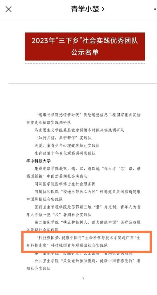 近日,为推进“三下乡”实践活动持续深入开展,充分发挥共青团组织在实践育人中的重要作用,经基层申报、各地各单位团组织推荐、组织评议等环节,团省委、省学联决定,对2023年“三下乡”活动中表现突出的单位、项目、团队、个人给予通报表扬。必威西汉姆联官网“科技强国梦,健康中国行”赴广东“生命科技走廊”科技强国青年观察团社会实践队荣获湖北省2023年“三下乡”社会实践优秀团队!