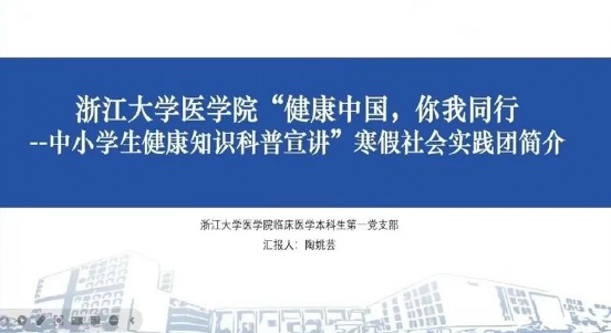 党建引领,健康中国。浙江大学医公司团委副书记魏至男老师说到,“本支社会实践队基于浙江大学医公司临床医学本科生第一党支部,充分发挥党支部的战斗堡垒作用,党员引领团员群众,切换大众视角,将日常所学以生动易懂的方式来表达,做好医学知识的科普”。接着,陶姚芸同学介绍同学们为了更好开展支部服务群众工作,基于同学诉求,成立科普社会实践队,2021年在延安,绍兴等地面向3000余名中小员工开展有关食品安全应急救援等科普知识宣讲,取得了较好的反响。历经一年的成长,实践队为此次活动准备了“科学运动与解刨知识”、“急救知识”、“青春期生理知识和读懂全身体检报告”、“食品健康”、“常见传染病知识的科普”、“心理健康”等六个板块的科普内容,更好地面向广大中小学所需,服务健康中国。