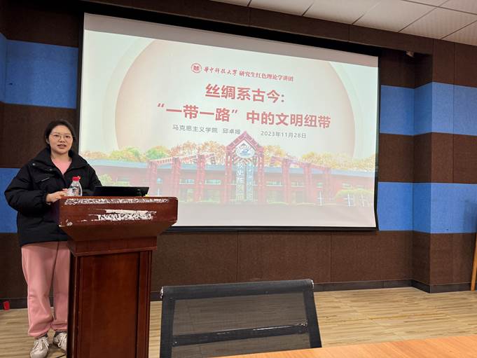 研究生红色理论学讲团讲师邱卓娅从文化角度切入,介绍了历史上“一带一路”的文化交流,展示了新时代“一带一路”在中华文明传播中的贡献,揭示了“一带一路”伟大倡议对于加强沿线国家之间文明交流与互鉴、促进共同繁荣的重要作用。