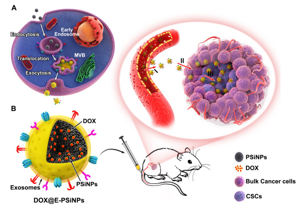 In our study, we constructed exosome-biomimetic porous silicon nanoparticles (E-PSiNPs) exocytosed from tumor cells for CSCs targeting therapy. When tumor cells were incubated with PSiNPs, tumor cells could exocytose the internalized PSiNPs through autophagy. Exosome membrane structure with the thickness of 20 nm was coated around the exocytosed PSiNPs by immunofluorescence, western blot and so on. Compared with traditional exosome purification method, the yield of exosomes was improved by about 34 times and the functional proteins of exosomes were reserved in E-PSiNPs. E-PSiNPs could target bulk tumor cells and CSCs efficiently. Importantly, doxorubicin loaded E-PSiNPs (DOX@E-PSiNPs) exhibited cross-reactive cellular internalization and cytotoxicity in bulk cancer cells and CSCs, which can solve the problem that targeting different CSCs needs different targeting molecular. DOX@E-PSiNPs also could efficiently accumulate in tumor tissues, extravasate from tumor vessels and deeply penetrate into tumor tissues. All these behaviors were related with CD54, an adhesion molecule expressed on E-PSiNPs. Based on these unique characterization, DOX@E-PSiNPs achieved remarkable accumulation in bulk cancer cells and CSCs in tumor tissues, exhibiting excellent antitumor effects and CSCs cytotoxicity in subcutaneous liver tumor model, orthotopic breast tumor model and melanoma lung metastasis tumor model. This study provides new sights for the application of tumor cell-derived exosome biomimetic nanoparticles in tumor therapy.