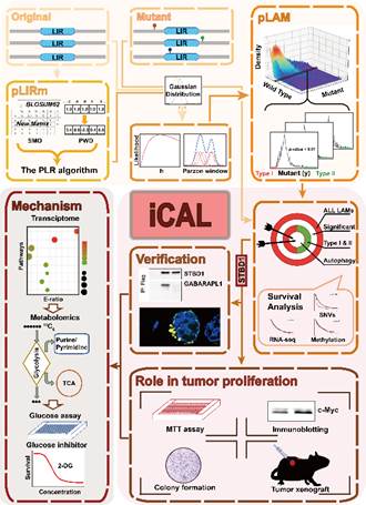 In this study, our teams have developed a pipeline called “inference of cancer-associated LC3-interacting region-containing proteins” (iCAL), which integrated publicly available cancer mutations, a machine learning sequence-based predictor, a model-based computational method for inferring LIR motif-associated mutations, multi-omics pan-cancer analysis and experimental approaches in vitro and in vivo. Using iCAL, we have identified 222 LIR motif-associated mutations (LAMs) in 148 LIR-containing proteins (LIRCPs), and validated that LAMs in ATG4B, STBD1, EHMT2 and BRAF impaired/enhanced their interactions with LC3 and autophagy activities. In pan-cancer analysis, the glycophagy adaptor STBD1 showed potential tumor suppressive activity. Meanwhile we performed immunohistochemistry (IHC) staining in colon cancer specimens and found that the expression of STBD1 at the protein level was significantly lower in the cancer tissues. Further study verified that mutation in STBD1 (W203C) disrupted the LIR motif to decrease the co-localization among STBD1, LC3B/ GABARAPL1 and glycogen, which suppressed the glycogen metabolism and glycophagy. Using multiple cell lines and mouse tumor xenograft model, we found that overexpression of STBD1 inhibited the growth of cancer cells, whereas silencing of STBD1 or STBD1 W203C was pro-tumorigenic. Using RNA sequencing (RNA-seq) technology, we found that shSTBD1 or STBD1 W203C could lead to metabolic reprogramming. Combined with the result of metabolomic profiling and isotope tracing analysis, it was found that STBD1 suppression enhanced glycolysis, boosted the TCA cycle, and promoted nucleotide biosynthesis through the pentose phosphate pathway, which could further promote tumorigenesis. Finally, according to 148 identified LIRCPs, we modeled a LIRCP-regulating network to infer that mutation could affect 9 classes of autophagy pathways perturbed in human cancer. Overall, iCAL is a useful resource to investigate the link between aberrant autophagy and human cancer. Using iCAL, we systematically identified mutations that altered LIR motif and verified the mechanism of cancer mutation effecting autophagy selectivity. And we firstly clarified the molecular mechanism of glycophagy participating in cancer regulation, by identifying mutation W203C could change STBD1 LIR motif and suppress both glycogen metabolism and glycophagy, which promoted tumorigenesis. We hope that iCAL can help the community to discover and verify novel autophagy pathways for cancer development, and lead, ultimately, to new cancer therapeutic approaches via manipulating these pathways.