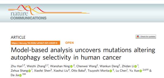 On May 31st, 2021, the teams of Prof. Yu Xue from College of Life Science & Technology, Huazhong University of Science, Prof. Da Jia and Prof. Lu Cheng from West China Second University Hospital, State Key Laboratory of Biotherapy and Collaborative Innovation Center of Biotherapy, Sichuan University and Dr. Xiaohui Liu from School of Life Sciences, Tsinghua University published a research article entitled “Model-based analysis uncovers mutations altering autophagy selectivity in human cancer” in Nature Communications. The Ph.D. Zhu Han and Weizhi Zhang are co-first authors of this article. Weizhi Zhang is the Ph.D. candidate of Bioinformatics, College of Life Science & Technology, Huazhong University of Science. Prof. Lu Chen and Dr. Xiaohui Liu are the co-authors. Prof. Yu Xue and Prof. Da Jia are the corresponding authors.