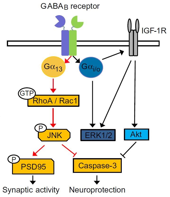 Professor Liu’s team continued the previous researches, and they further discovered that GABAB receptors can not only couple to Gi/o, but also activate G13 to regulate synaptic functions and neuroprotection through G13/JNK pathway in primary cultured neurons. These conclusions will help us better understand the functional diversity of GABAB receptors in the brain and provide new ideas for development of drugs targeting GABAB receptors. GABAB receptors activate different MAPK signaling pathways by coupling different G proteins, thereby play a neuroprotective effect through the synergy of G13/Rac1/JNK and Gi/o/IGF1R/Akt pathway. This suggests that for some specific GPCRs, two different signaling pathways are required to regulate their functions together, which is of vital guiding significance to better understand the functional diversity of GPCRs.